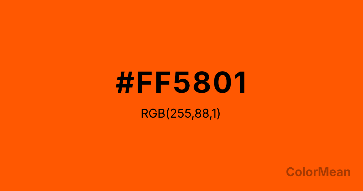 #FF5801 RGB value is (255, 88, 1). The hex color red value is 255, green is 88, and blue is 1. Its HSL format shows a hue of 21°, saturation of 100 percent, and lightness of 50 percent. The CMYK process values are 0 percent, 65 percent, 100 percent, 0 percent.