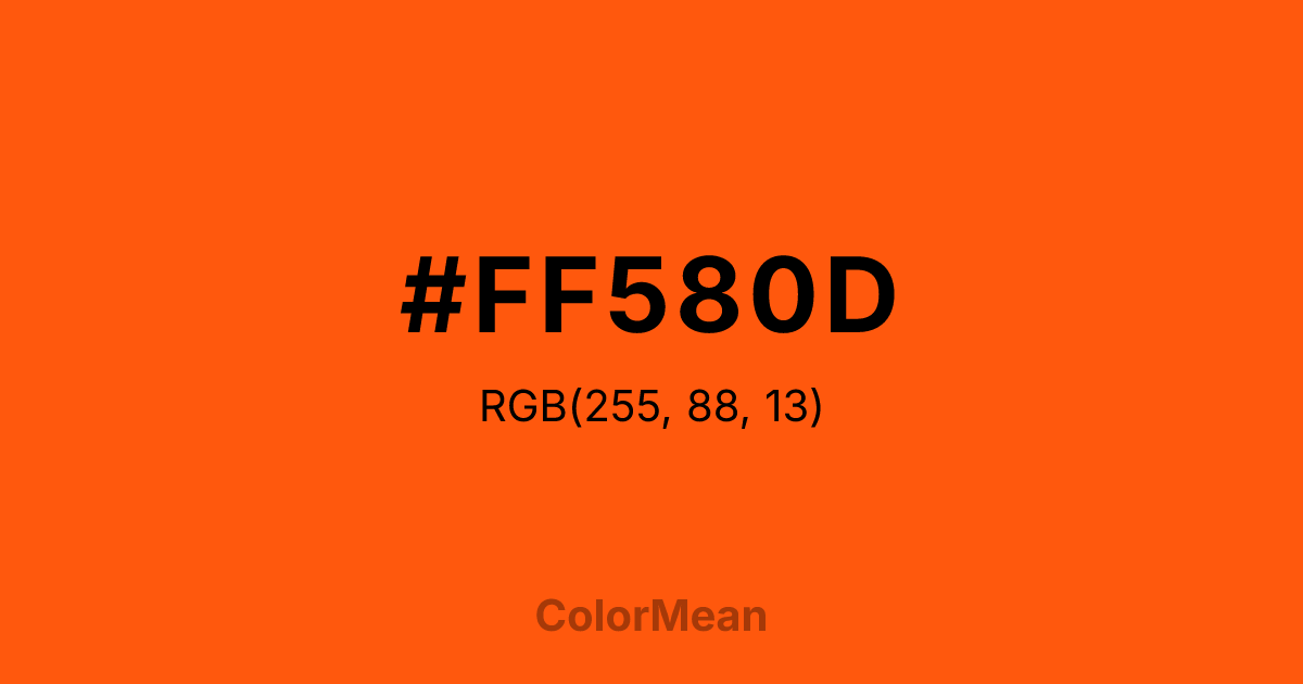 #FF580D RGB value is (255, 88, 13). The hex color red value is 255, green is 88, and blue is 13. Its HSL format shows a hue of 19°, saturation of 100 percent, and lightness of 53 percent. The CMYK process values are 0 percent, 65 percent, 95 percent, 0 percent.