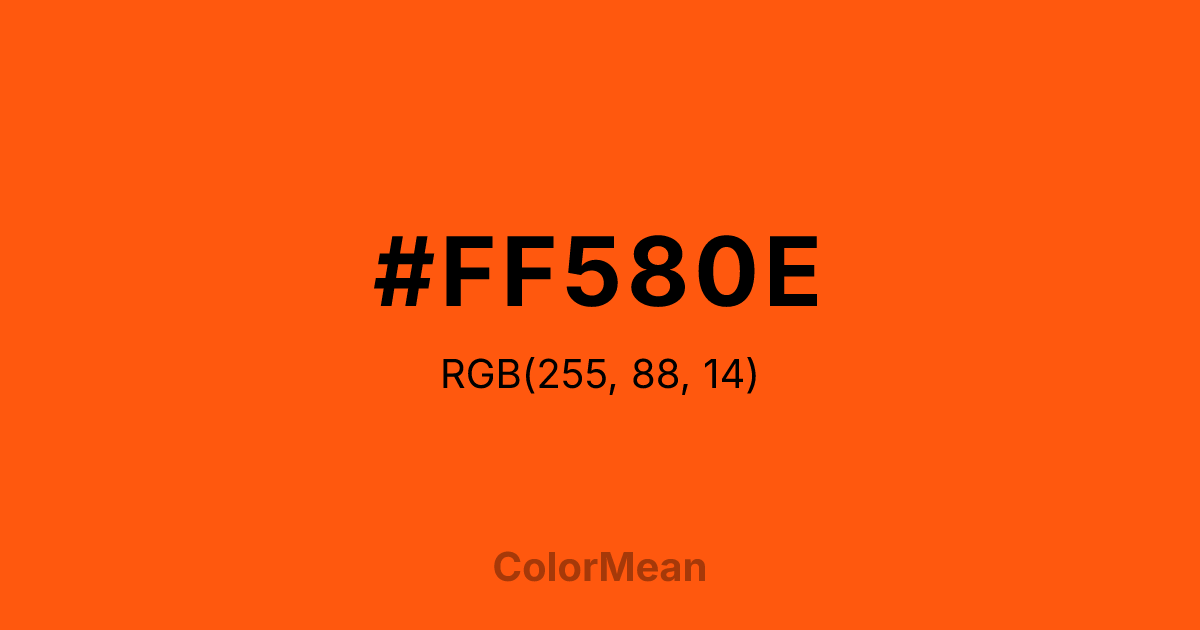 #FF580E RGB value is (255, 88, 14). The hex color red value is 255, green is 88, and blue is 14. Its HSL format shows a hue of 18°, saturation of 100 percent, and lightness of 53 percent. The CMYK process values are 0 percent, 65 percent, 95 percent, 0 percent.