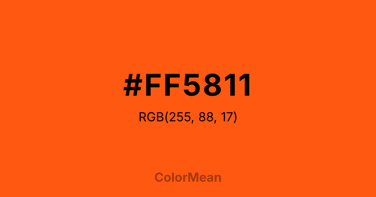 #FF5811 RGB value is (255, 88, 17). The hex color red value is 255, green is 88, and blue is 17. Its HSL format shows a hue of 18°, saturation of 100 percent, and lightness of 53 percent. The CMYK process values are 0 percent, 65 percent, 93 percent, 0 percent.