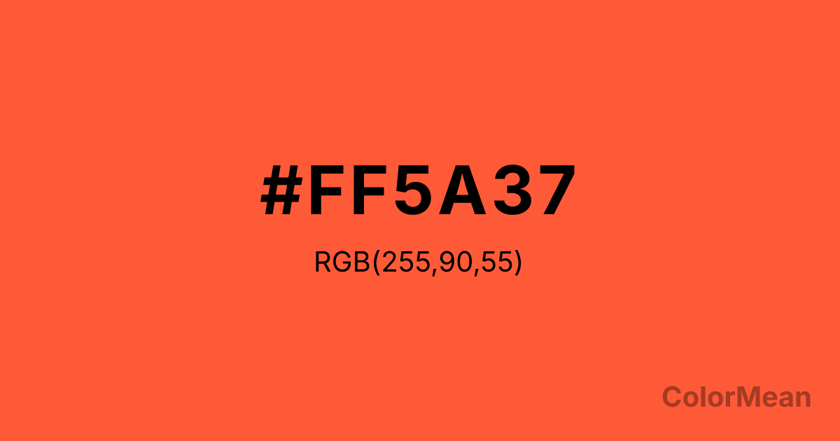 #FF5A37 RGB value is (255, 90, 55). The hex color red value is 255, green is 90, and blue is 55. Its HSL format shows a hue of 11°, saturation of 100 percent, and lightness of 61 percent. The CMYK process values are 0 percent, 65 percent, 78 percent, 0 percent.