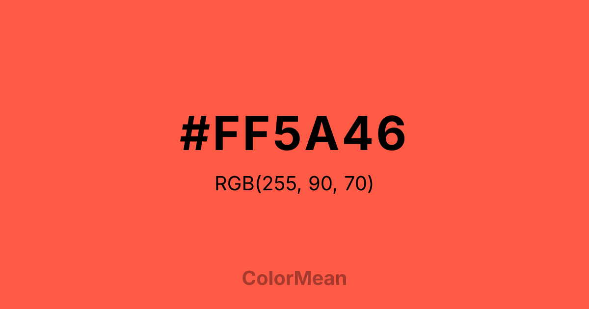 #FF5A46 RGB value is (255, 90, 70). The hex color red value is 255, green is 90, and blue is 70. Its HSL format shows a hue of 6°, saturation of 100 percent, and lightness of 64 percent. The CMYK process values are 0 percent, 65 percent, 73 percent, 0 percent.