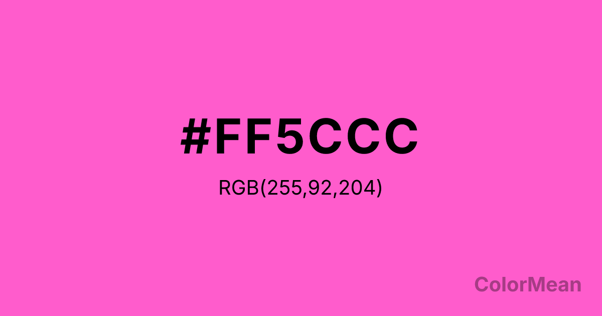 #FF5CCC RGB value is (255, 92, 204). The hex color red value is 255, green is 92, and blue is 204. Its HSL format shows a hue of 319°, saturation of 100 percent, and lightness of 68 percent. The CMYK process values are 0 percent, 64 percent, 20 percent, 0 percent.