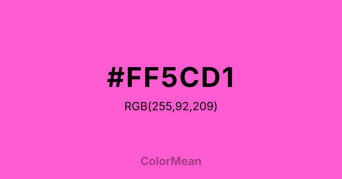 #FF5CD1 RGB value is (255, 92, 209). The hex color red value is 255, green is 92, and blue is 209. Its HSL format shows a hue of 317°, saturation of 100 percent, and lightness of 68 percent. The CMYK process values are 0 percent, 64 percent, 18 percent, 0 percent.