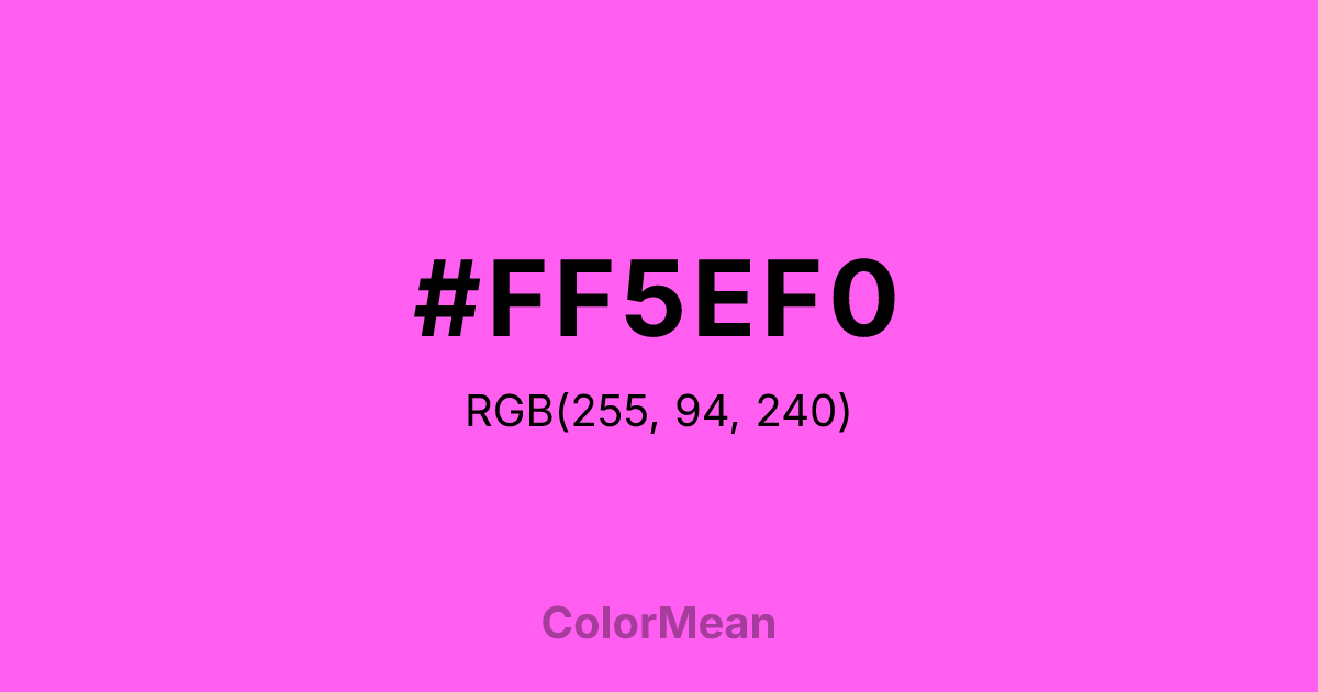 #FF5EF0 RGB value is (255, 94, 240). The hex color red value is 255, green is 94, and blue is 240. Its HSL format shows a hue of 306°, saturation of 100 percent, and lightness of 68 percent. The CMYK process values are 0 percent, 63 percent, 6 percent, 0 percent.