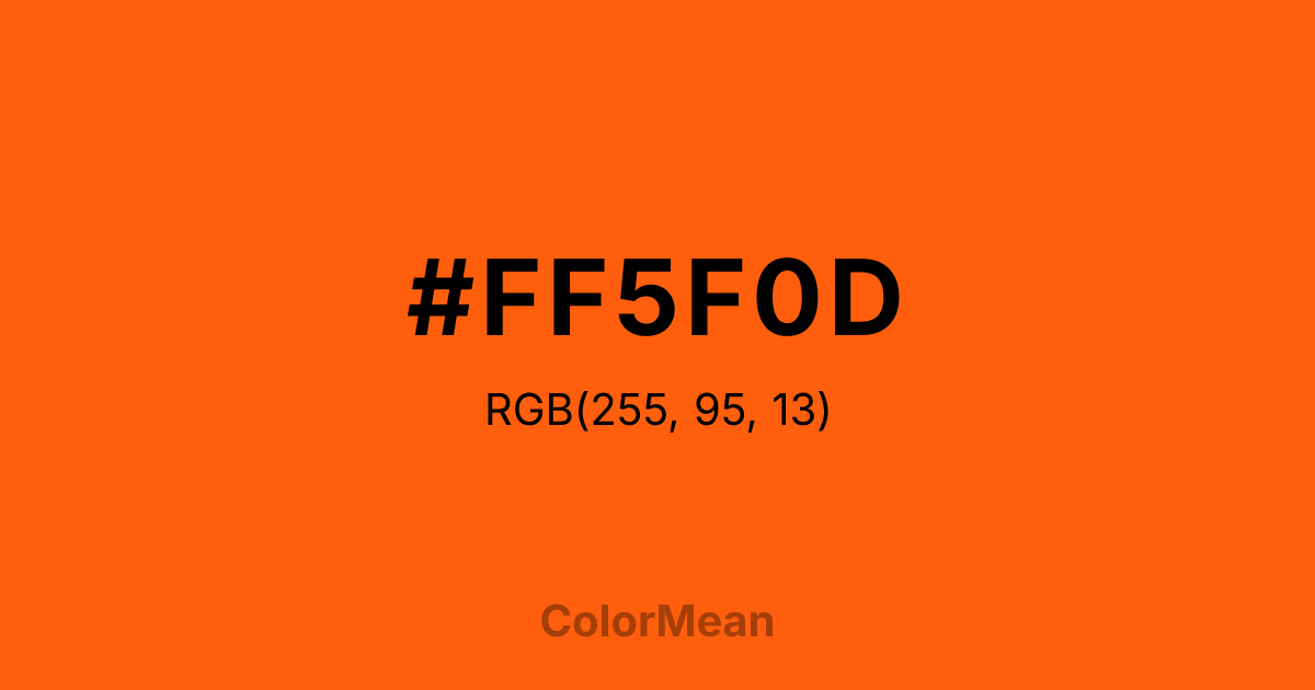 #FF5F0D RGB value is (255, 95, 13). The hex color red value is 255, green is 95, and blue is 13. Its HSL format shows a hue of 20°, saturation of 100 percent, and lightness of 53 percent. The CMYK process values are 0 percent, 63 percent, 95 percent, 0 percent.