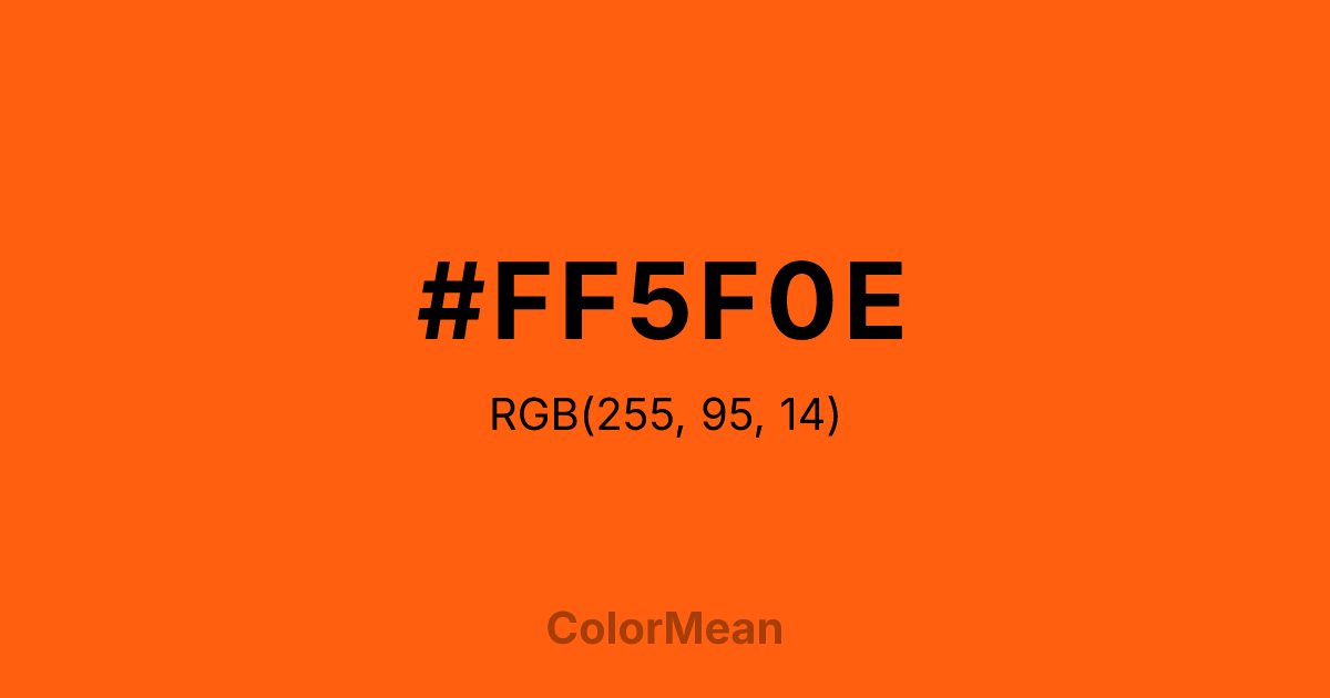 #FF5F0E RGB value is (255, 95, 14). The hex color red value is 255, green is 95, and blue is 14. Its HSL format shows a hue of 20°, saturation of 100 percent, and lightness of 53 percent. The CMYK process values are 0 percent, 63 percent, 95 percent, 0 percent.
