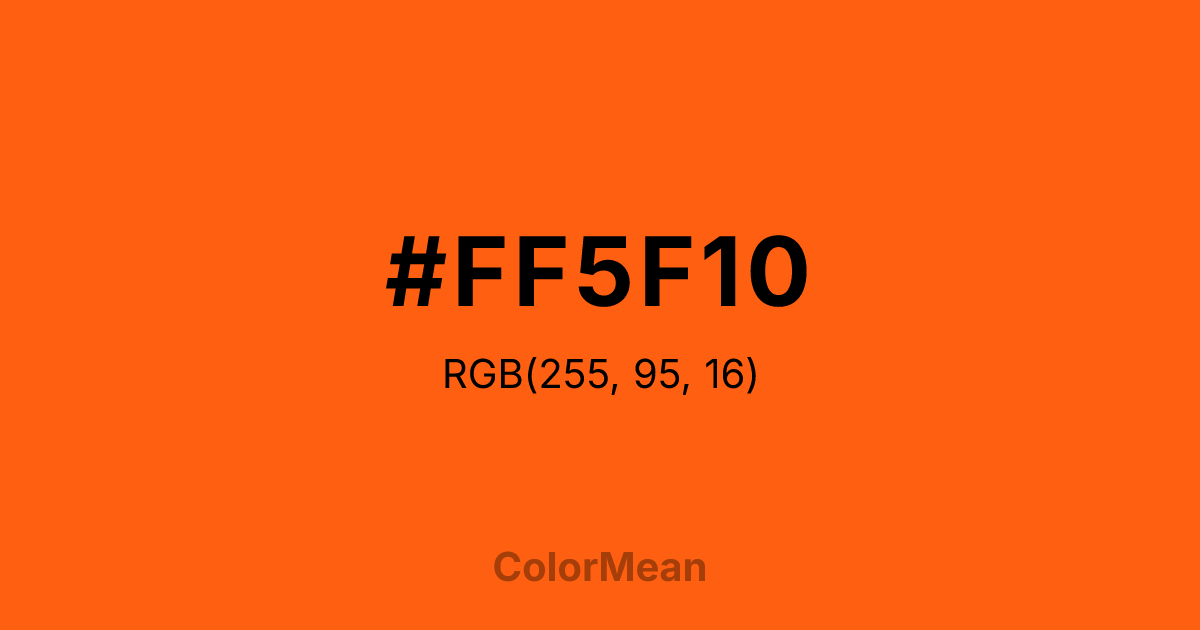 #FF5F10 RGB value is (255, 95, 16). The hex color red value is 255, green is 95, and blue is 16. Its HSL format shows a hue of 20°, saturation of 100 percent, and lightness of 53 percent. The CMYK process values are 0 percent, 63 percent, 94 percent, 0 percent.