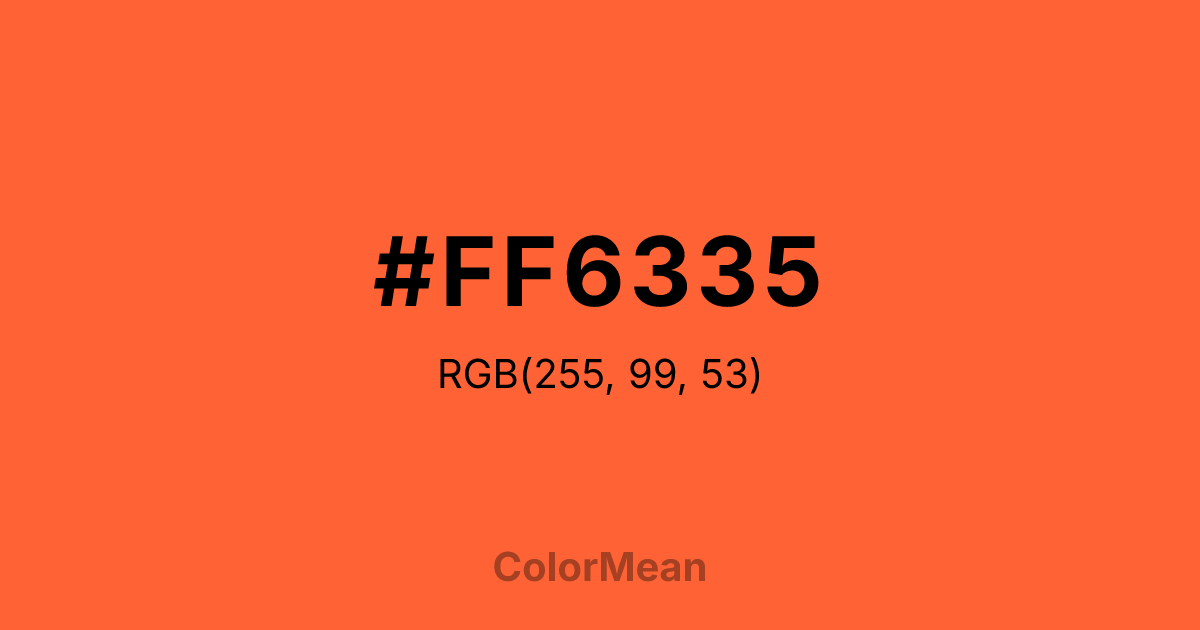 #FF6335 RGB value is (255, 99, 53). The hex color red value is 255, green is 99, and blue is 53. Its HSL format shows a hue of 14°, saturation of 100 percent, and lightness of 60 percent. The CMYK process values are 0 percent, 61 percent, 79 percent, 0 percent.
