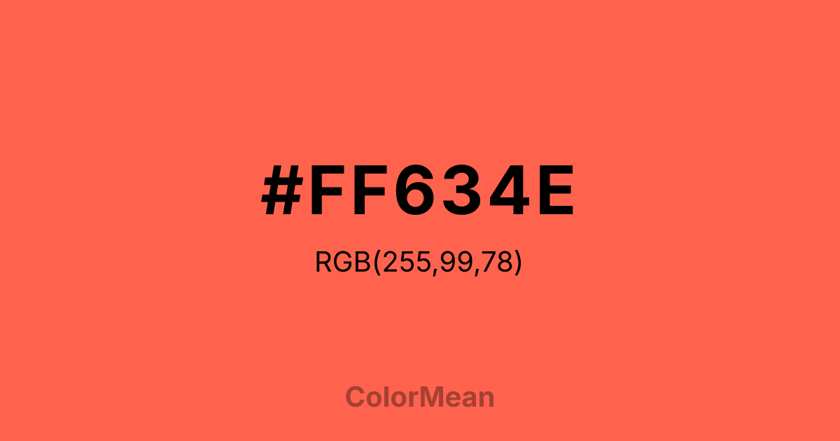 #FF634E RGB value is (255, 99, 78). The hex color red value is 255, green is 99, and blue is 78. Its HSL format shows a hue of 7°, saturation of 100 percent, and lightness of 65 percent. The CMYK process values are 0 percent, 61 percent, 69 percent, 0 percent.
