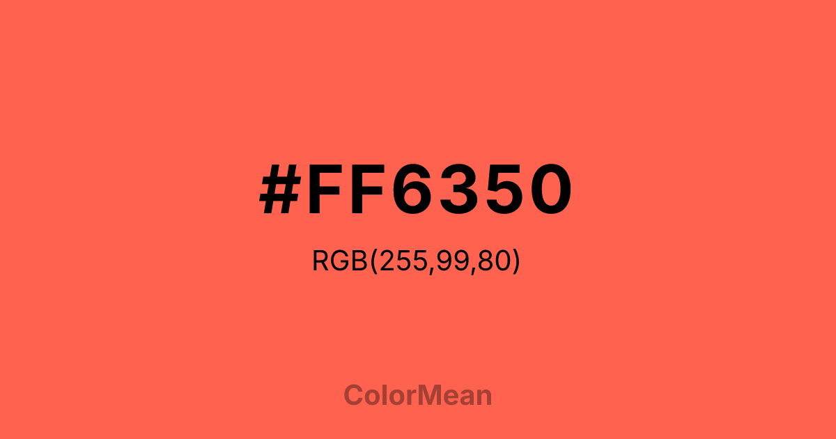#FF6350 RGB value is (255, 99, 80). The hex color red value is 255, green is 99, and blue is 80. Its HSL format shows a hue of 7°, saturation of 100 percent, and lightness of 66 percent. The CMYK process values are 0 percent, 61 percent, 69 percent, 0 percent.