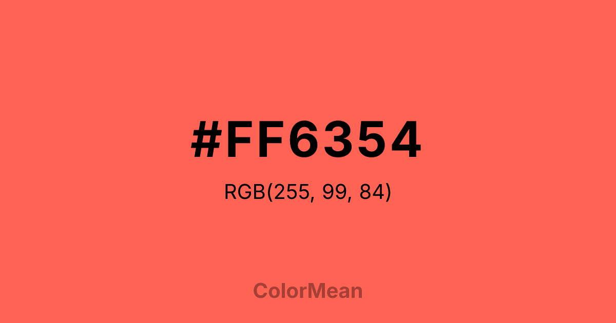 #FF6354 RGB value is (255, 99, 84). The hex color red value is 255, green is 99, and blue is 84. Its HSL format shows a hue of 5°, saturation of 100 percent, and lightness of 66 percent. The CMYK process values are 0 percent, 61 percent, 67 percent, 0 percent.