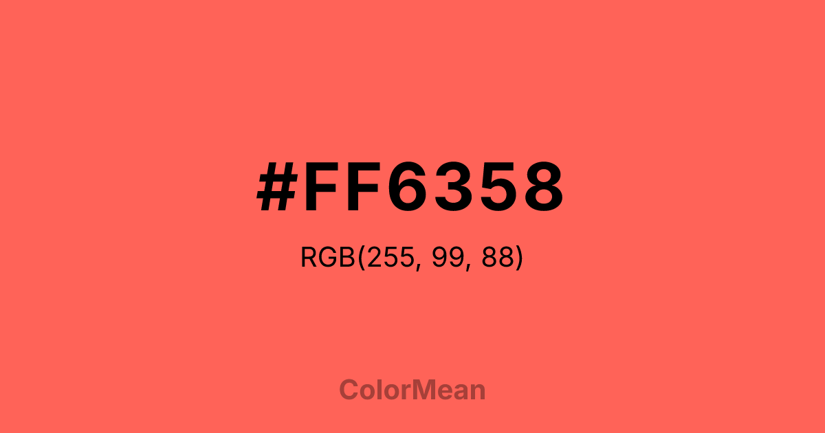#FF6358 RGB value is (255, 99, 88). The hex color red value is 255, green is 99, and blue is 88. Its HSL format shows a hue of 4°, saturation of 100 percent, and lightness of 67 percent. The CMYK process values are 0 percent, 61 percent, 65 percent, 0 percent.