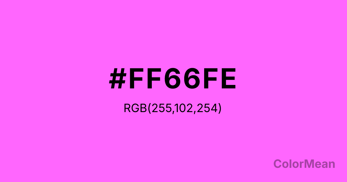 #FF66FE RGB value is (255, 102, 254). The hex color red value is 255, green is 102, and blue is 254. Its HSL format shows a hue of 300°, saturation of 100 percent, and lightness of 70 percent. The CMYK process values are 0 percent, 60 percent, 0 percent, 0 percent.