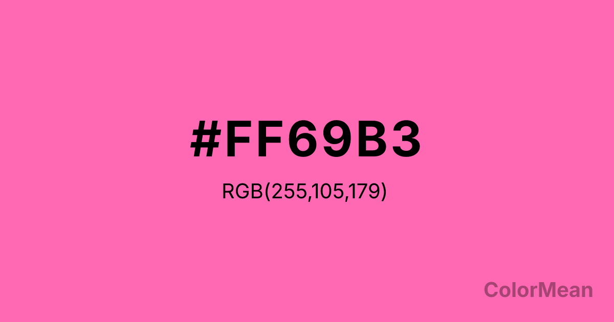 #FF69B3 RGB value is (255, 105, 179). The hex color red value is 255, green is 105, and blue is 179. Its HSL format shows a hue of 330°, saturation of 100 percent, and lightness of 71 percent. The CMYK process values are 0 percent, 59 percent, 30 percent, 0 percent.