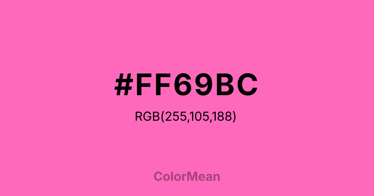 #FF69BC RGB value is (255, 105, 188). The hex color red value is 255, green is 105, and blue is 188. Its HSL format shows a hue of 327°, saturation of 100 percent, and lightness of 71 percent. The CMYK process values are 0 percent, 59 percent, 26 percent, 0 percent.