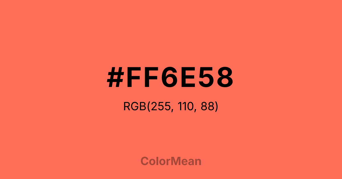 #FF6E58 RGB value is (255, 110, 88). The hex color red value is 255, green is 110, and blue is 88. Its HSL format shows a hue of 8°, saturation of 100 percent, and lightness of 67 percent. The CMYK process values are 0 percent, 57 percent, 65 percent, 0 percent.