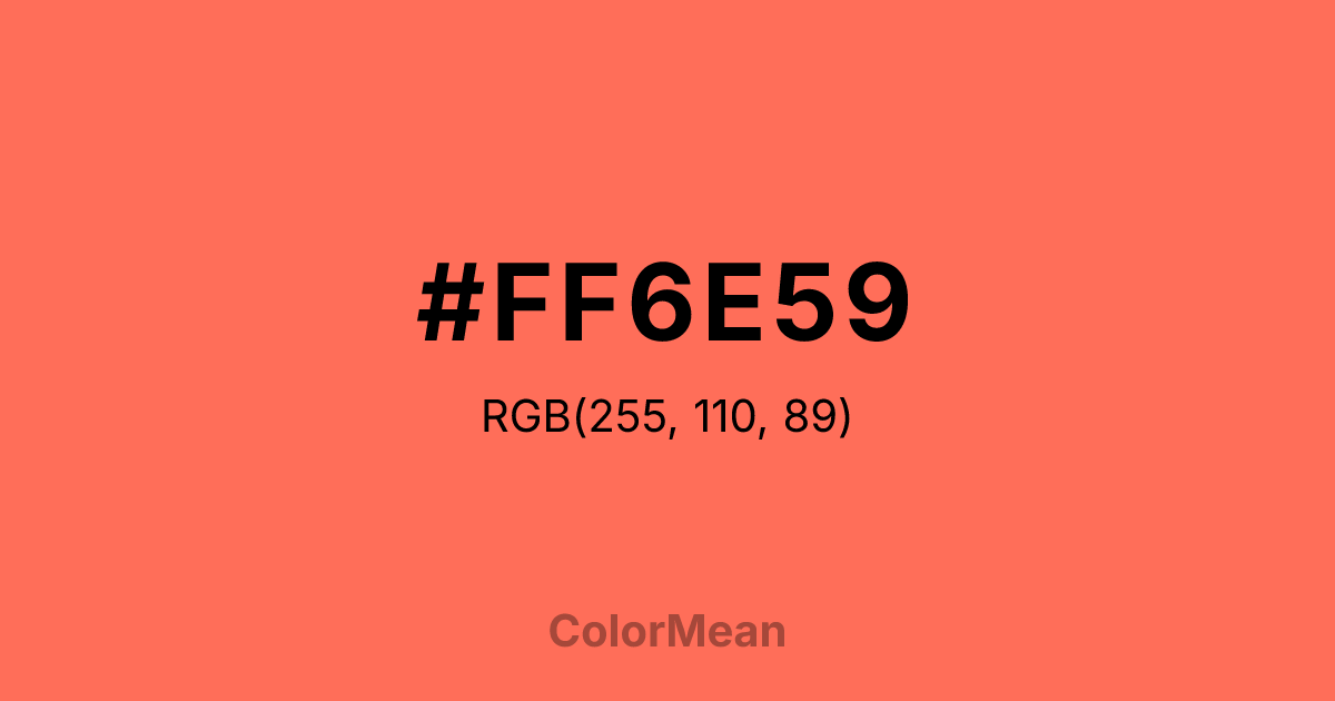 #FF6E59 RGB value is (255, 110, 89). The hex color red value is 255, green is 110, and blue is 89. Its HSL format shows a hue of 8°, saturation of 100 percent, and lightness of 67 percent. The CMYK process values are 0 percent, 57 percent, 65 percent, 0 percent.