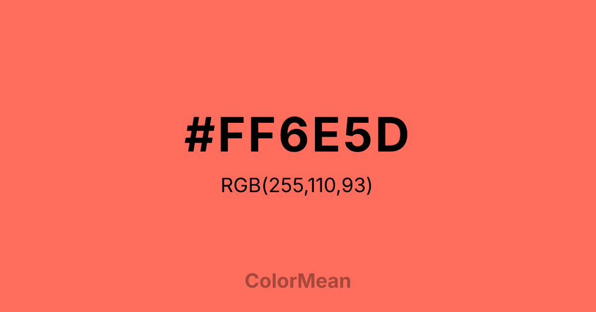#FF6E5D RGB value is (255, 110, 93). The hex color red value is 255, green is 110, and blue is 93. Its HSL format shows a hue of 6°, saturation of 100 percent, and lightness of 68 percent. The CMYK process values are 0 percent, 57 percent, 64 percent, 0 percent.