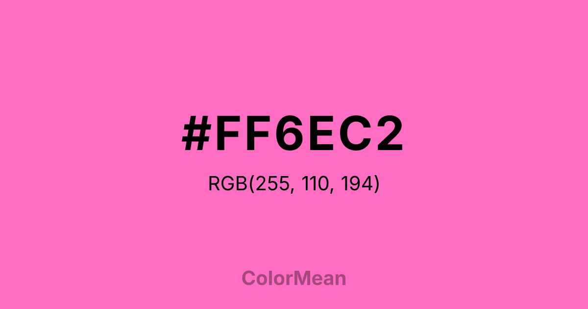 #FF6EC2 RGB value is (255, 110, 194). The hex color red value is 255, green is 110, and blue is 194. Its HSL format shows a hue of 325°, saturation of 100 percent, and lightness of 72 percent. The CMYK process values are 0 percent, 57 percent, 24 percent, 0 percent.