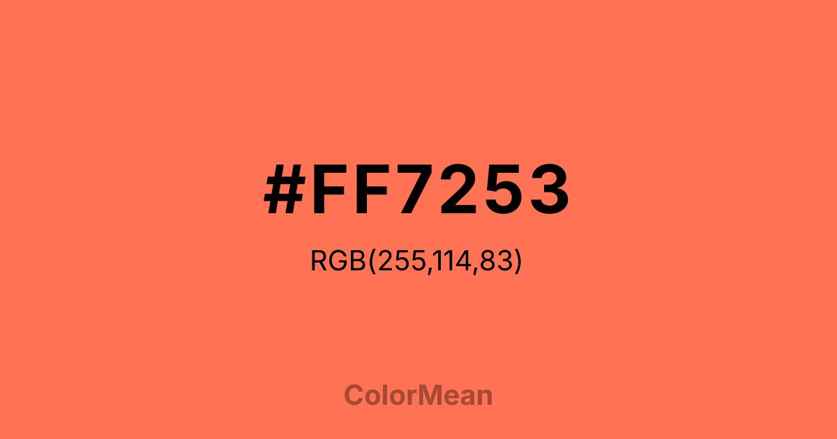 #FF7253 RGB value is (255, 114, 83). The hex color red value is 255, green is 114, and blue is 83. Its HSL format shows a hue of 11°, saturation of 100 percent, and lightness of 66 percent. The CMYK process values are 0 percent, 55 percent, 67 percent, 0 percent.