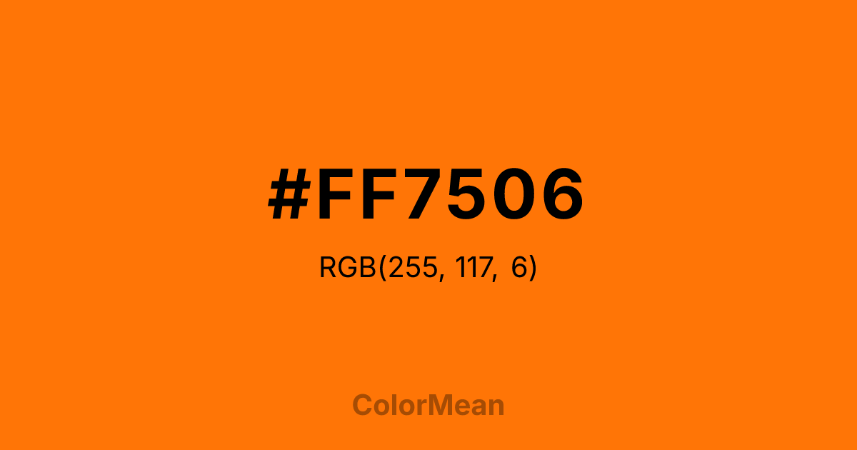 #FF7506 RGB value is (255, 117, 6). The hex color red value is 255, green is 117, and blue is 6. Its HSL format shows a hue of 27°, saturation of 100 percent, and lightness of 51 percent. The CMYK process values are 0 percent, 54 percent, 98 percent, 0 percent.