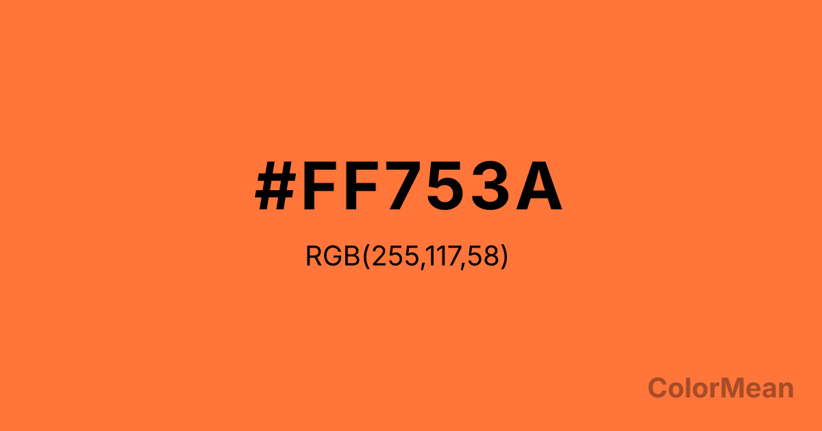 #FF753A RGB value is (255, 117, 58). The hex color red value is 255, green is 117, and blue is 58. Its HSL format shows a hue of 18°, saturation of 100 percent, and lightness of 61 percent. The CMYK process values are 0 percent, 54 percent, 77 percent, 0 percent.