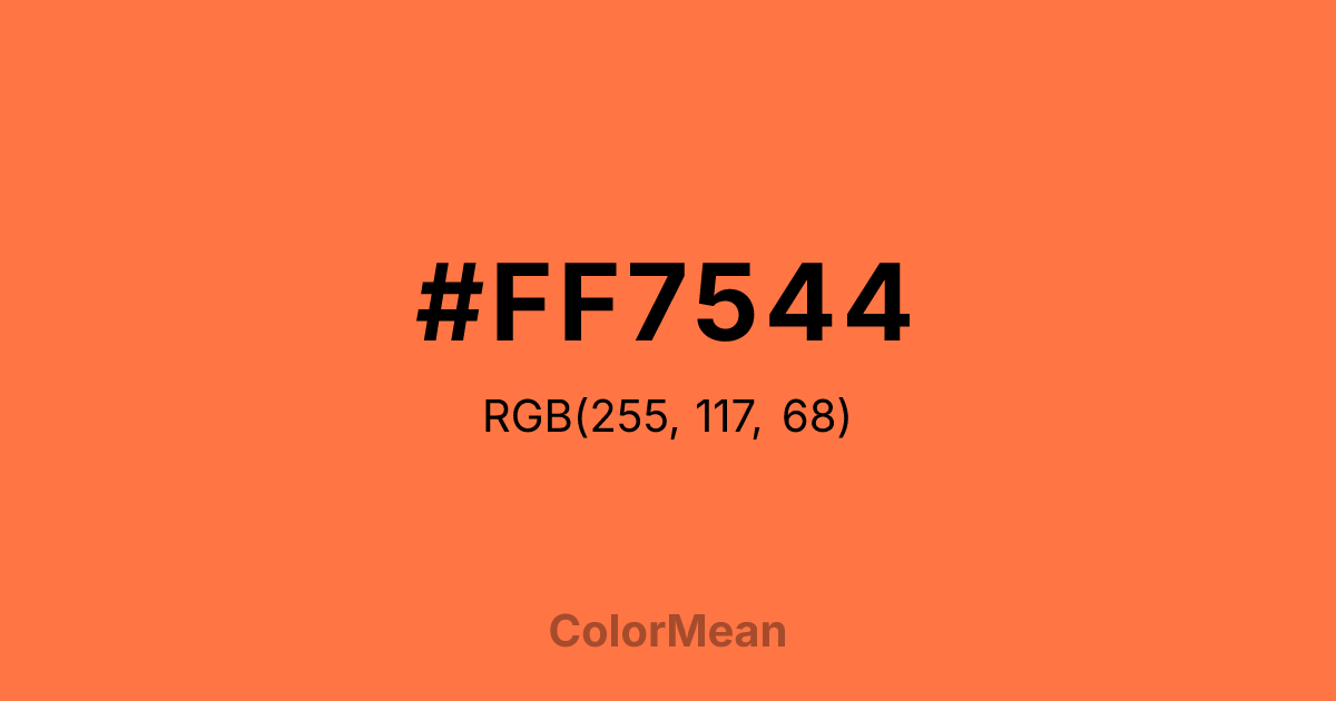 #FF7544 RGB value is (255, 117, 68). The hex color red value is 255, green is 117, and blue is 68. Its HSL format shows a hue of 16°, saturation of 100 percent, and lightness of 63 percent. The CMYK process values are 0 percent, 54 percent, 73 percent, 0 percent.