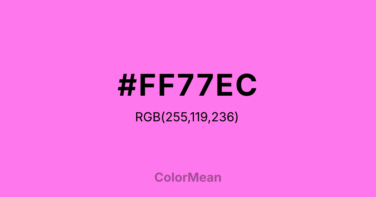 #FF77EC RGB value is (255, 119, 236). The hex color red value is 255, green is 119, and blue is 236. Its HSL format shows a hue of 308°, saturation of 100 percent, and lightness of 73 percent. The CMYK process values are 0 percent, 53 percent, 7 percent, 0 percent.