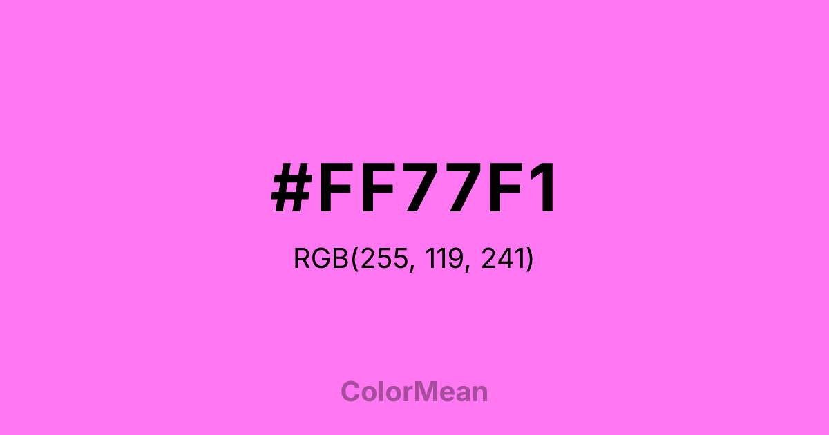 #FF77F1 RGB value is (255, 119, 241). The hex color red value is 255, green is 119, and blue is 241. Its HSL format shows a hue of 306°, saturation of 100 percent, and lightness of 73 percent. The CMYK process values are 0 percent, 53 percent, 5 percent, 0 percent.