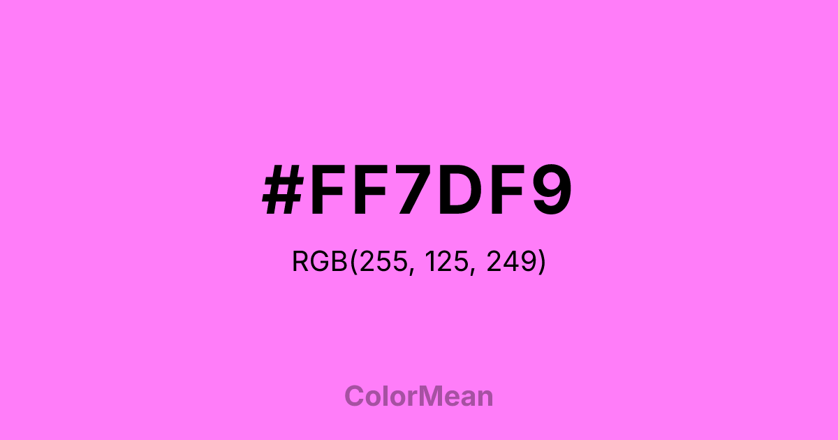 #FF7DF9 RGB value is (255, 125, 249). The hex color red value is 255, green is 125, and blue is 249. Its HSL format shows a hue of 303°, saturation of 100 percent, and lightness of 75 percent. The CMYK process values are 0 percent, 51 percent, 2 percent, 0 percent.