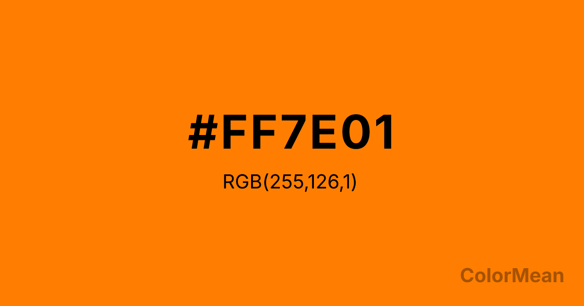 #FF7E01 RGB value is (255, 126, 1). The hex color red value is 255, green is 126, and blue is 1. Its HSL format shows a hue of 30°, saturation of 100 percent, and lightness of 50 percent. The CMYK process values are 0 percent, 51 percent, 100 percent, 0 percent.