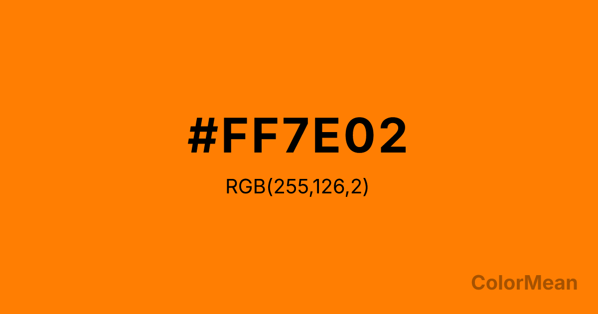 #FF7E02 RGB value is (255, 126, 2). The hex color red value is 255, green is 126, and blue is 2. Its HSL format shows a hue of 29°, saturation of 100 percent, and lightness of 50 percent. The CMYK process values are 0 percent, 51 percent, 99 percent, 0 percent.
