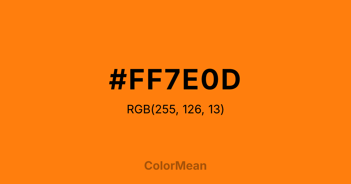 #FF7E0D RGB value is (255, 126, 13). The hex color red value is 255, green is 126, and blue is 13. Its HSL format shows a hue of 28°, saturation of 100 percent, and lightness of 53 percent. The CMYK process values are 0 percent, 51 percent, 95 percent, 0 percent.