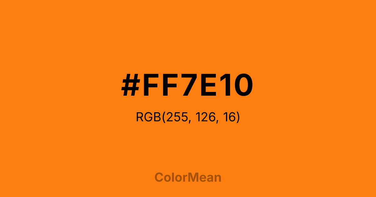 #FF7E10 RGB value is (255, 126, 16). The hex color red value is 255, green is 126, and blue is 16. Its HSL format shows a hue of 28°, saturation of 100 percent, and lightness of 53 percent. The CMYK process values are 0 percent, 51 percent, 94 percent, 0 percent.