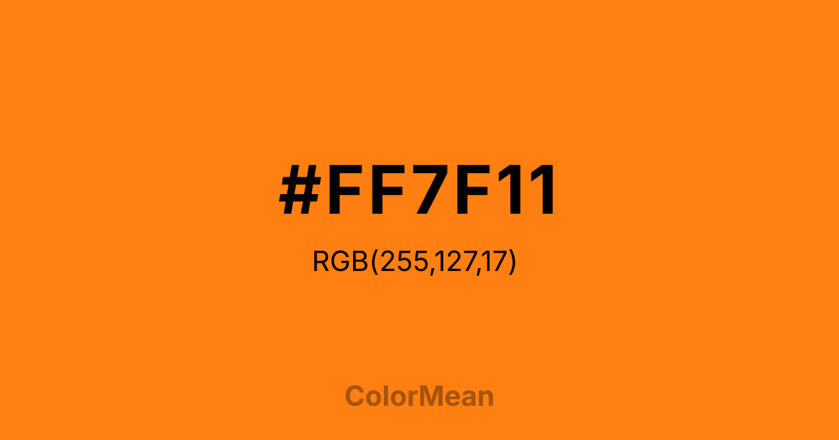 #FF7F11 RGB value is (255, 127, 17). The hex color red value is 255, green is 127, and blue is 17. Its HSL format shows a hue of 28°, saturation of 100 percent, and lightness of 53 percent. The CMYK process values are 0 percent, 50 percent, 93 percent, 0 percent.