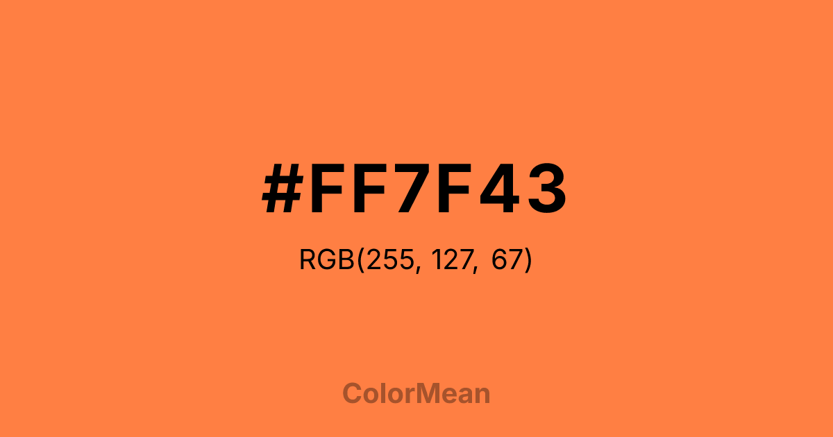 #FF7F43 RGB value is (255, 127, 67). The hex color red value is 255, green is 127, and blue is 67. Its HSL format shows a hue of 19°, saturation of 100 percent, and lightness of 63 percent. The CMYK process values are 0 percent, 50 percent, 74 percent, 0 percent.