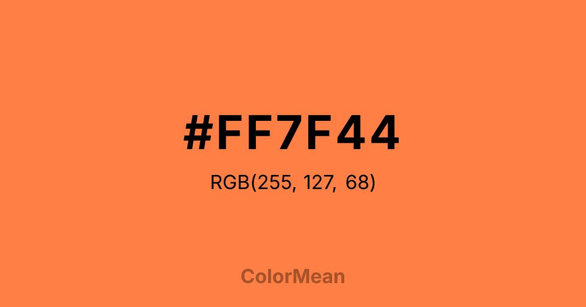 #FF7F44 RGB value is (255, 127, 68). The hex color red value is 255, green is 127, and blue is 68. Its HSL format shows a hue of 19°, saturation of 100 percent, and lightness of 63 percent. The CMYK process values are 0 percent, 50 percent, 73 percent, 0 percent.