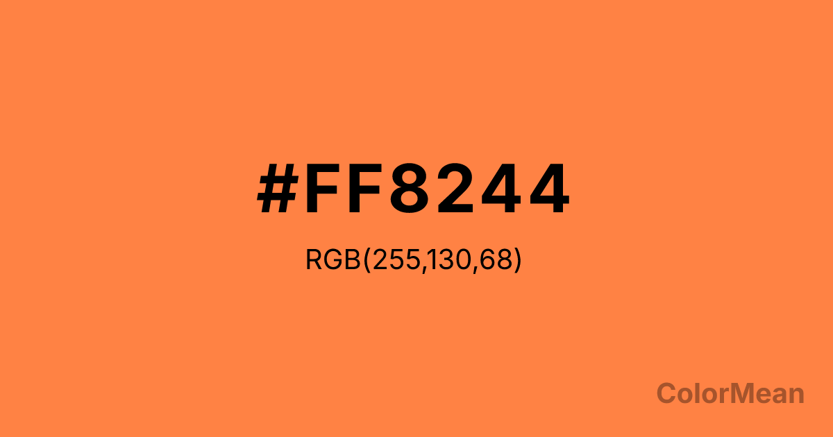 #FF8244 RGB value is (255, 130, 68). The hex color red value is 255, green is 130, and blue is 68. Its HSL format shows a hue of 20°, saturation of 100 percent, and lightness of 63 percent. The CMYK process values are 0 percent, 49 percent, 73 percent, 0 percent.