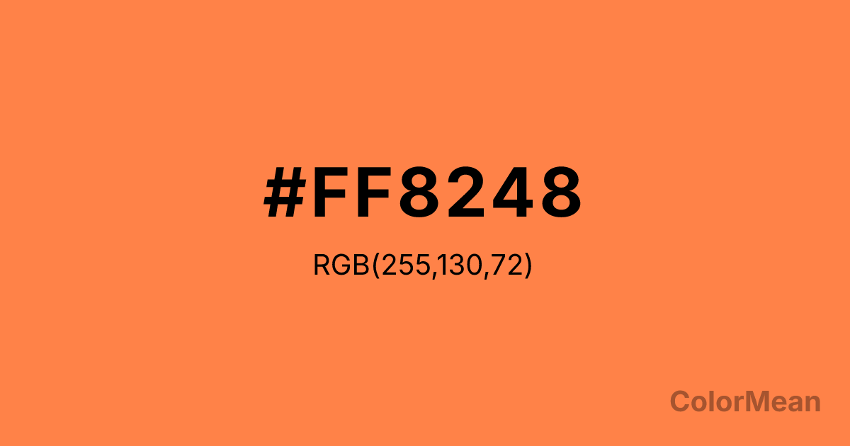 #FF8248 RGB value is (255, 130, 72). The hex color red value is 255, green is 130, and blue is 72. Its HSL format shows a hue of 19°, saturation of 100 percent, and lightness of 64 percent. The CMYK process values are 0 percent, 49 percent, 72 percent, 0 percent.