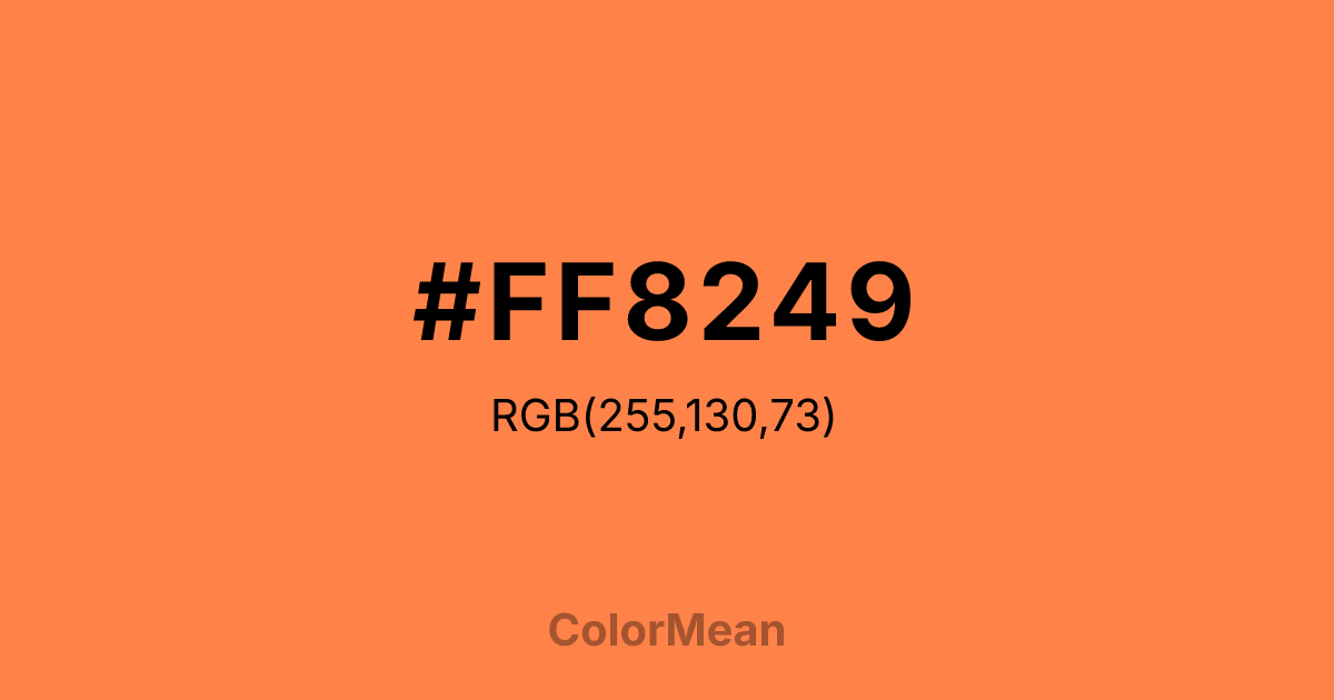#FF8249 RGB value is (255, 130, 73). The hex color red value is 255, green is 130, and blue is 73. Its HSL format shows a hue of 19°, saturation of 100 percent, and lightness of 64 percent. The CMYK process values are 0 percent, 49 percent, 71 percent, 0 percent.