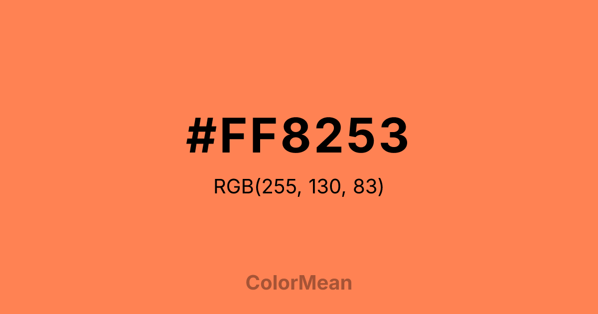 #FF8253 RGB value is (255, 130, 83). The hex color red value is 255, green is 130, and blue is 83. Its HSL format shows a hue of 16°, saturation of 100 percent, and lightness of 66 percent. The CMYK process values are 0 percent, 49 percent, 67 percent, 0 percent.