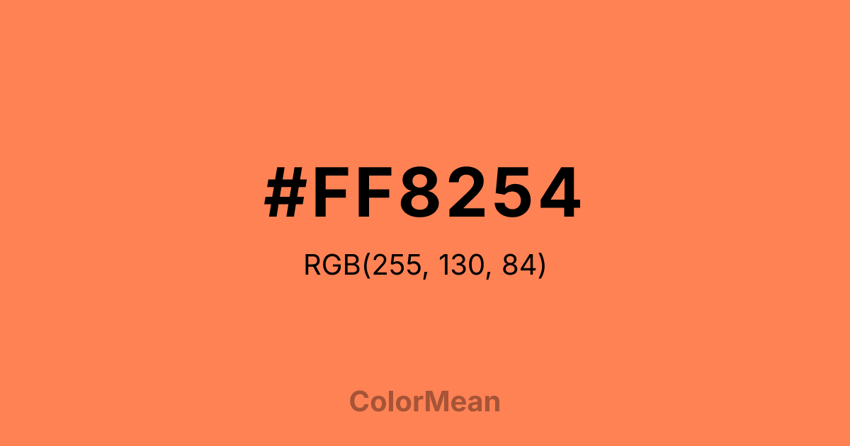 #FF8254 RGB value is (255, 130, 84). The hex color red value is 255, green is 130, and blue is 84. Its HSL format shows a hue of 16°, saturation of 100 percent, and lightness of 66 percent. The CMYK process values are 0 percent, 49 percent, 67 percent, 0 percent.
