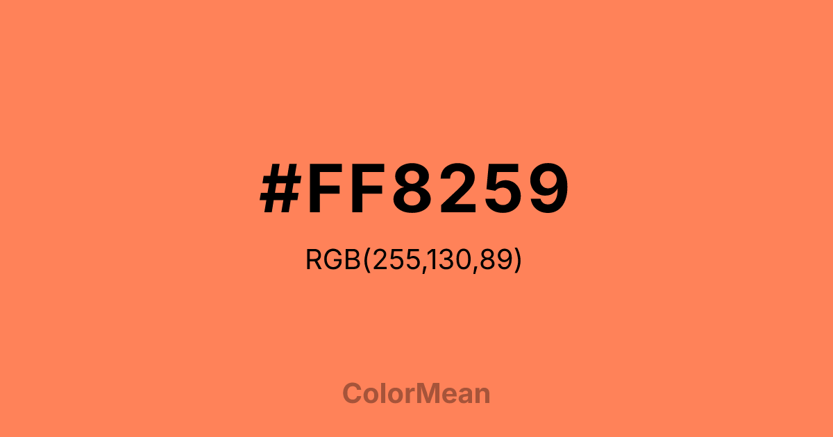 #FF8259 RGB value is (255, 130, 89). The hex color red value is 255, green is 130, and blue is 89. Its HSL format shows a hue of 15°, saturation of 100 percent, and lightness of 67 percent. The CMYK process values are 0 percent, 49 percent, 65 percent, 0 percent.