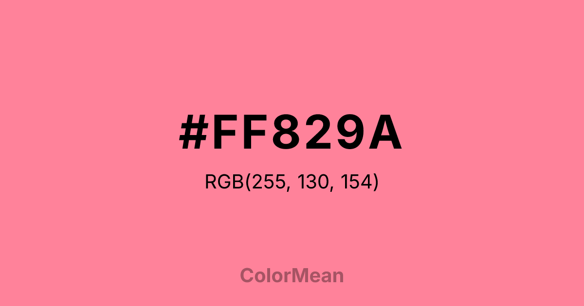 #FF829A RGB value is (255, 130, 154). The hex color red value is 255, green is 130, and blue is 154. Its HSL format shows a hue of 348°, saturation of 100 percent, and lightness of 75 percent. The CMYK process values are 0 percent, 49 percent, 40 percent, 0 percent.