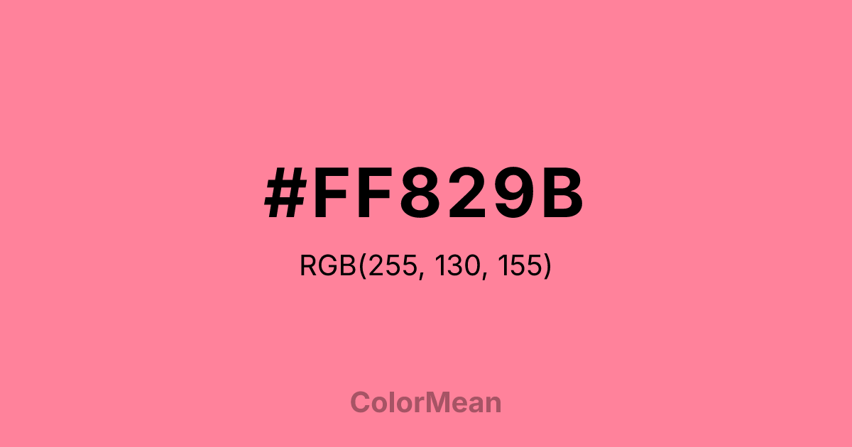 #FF829B RGB value is (255, 130, 155). The hex color red value is 255, green is 130, and blue is 155. Its HSL format shows a hue of 348°, saturation of 100 percent, and lightness of 75 percent. The CMYK process values are 0 percent, 49 percent, 39 percent, 0 percent.
