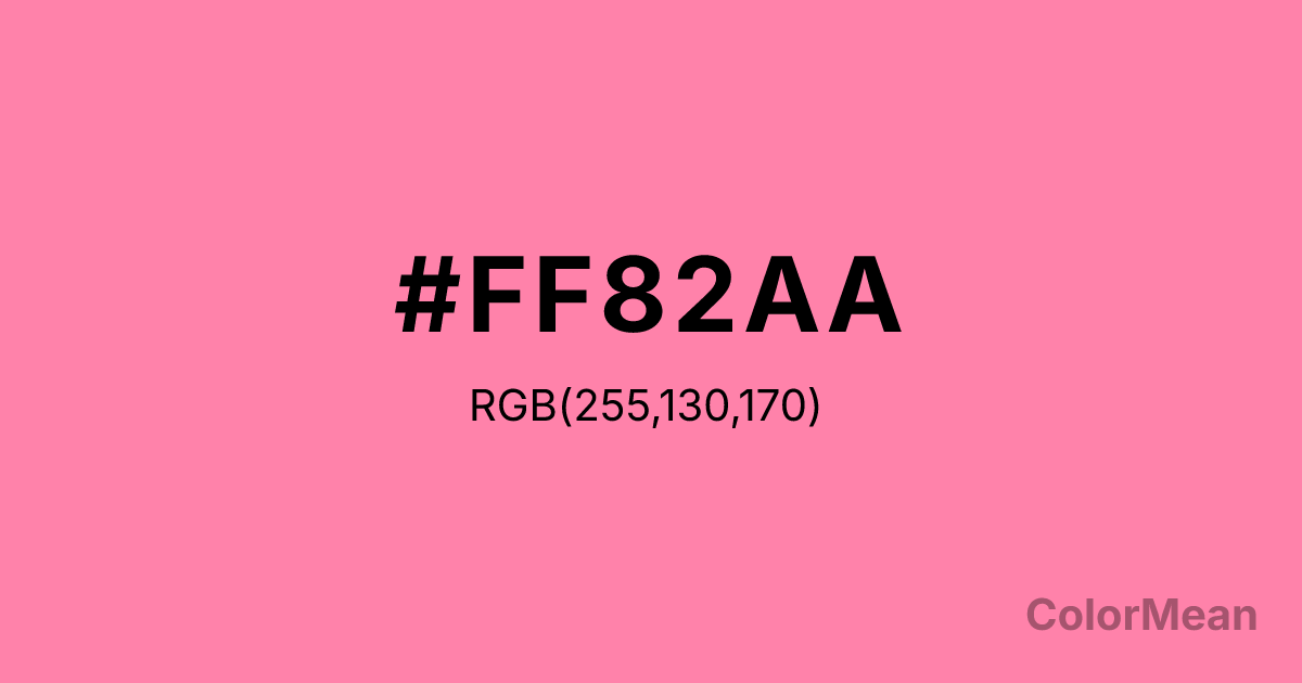 #FF82AA RGB value is (255, 130, 170). The hex color red value is 255, green is 130, and blue is 170. Its HSL format shows a hue of 341°, saturation of 100 percent, and lightness of 75 percent. The CMYK process values are 0 percent, 49 percent, 33 percent, 0 percent.