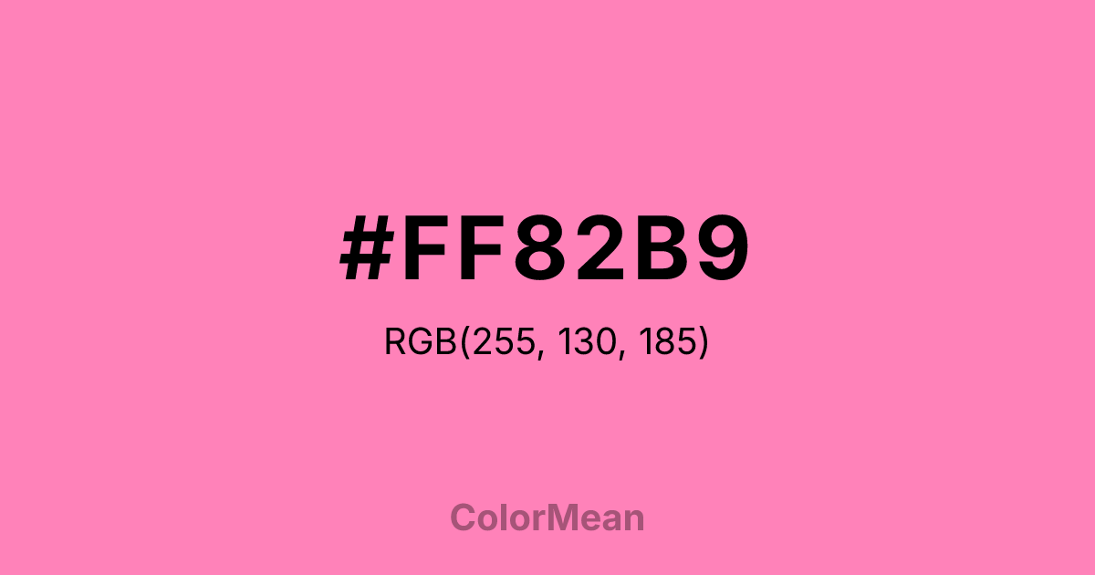 #FF82B9 RGB value is (255, 130, 185). The hex color red value is 255, green is 130, and blue is 185. Its HSL format shows a hue of 334°, saturation of 100 percent, and lightness of 75 percent. The CMYK process values are 0 percent, 49 percent, 27 percent, 0 percent.