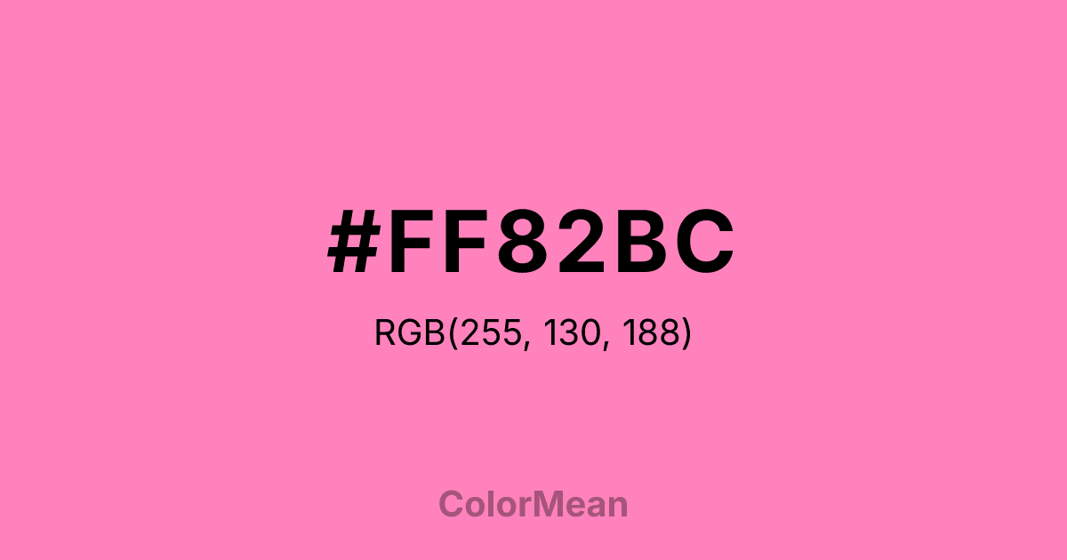 #FF82BC RGB value is (255, 130, 188). The hex color red value is 255, green is 130, and blue is 188. Its HSL format shows a hue of 332°, saturation of 100 percent, and lightness of 75 percent. The CMYK process values are 0 percent, 49 percent, 26 percent, 0 percent.
