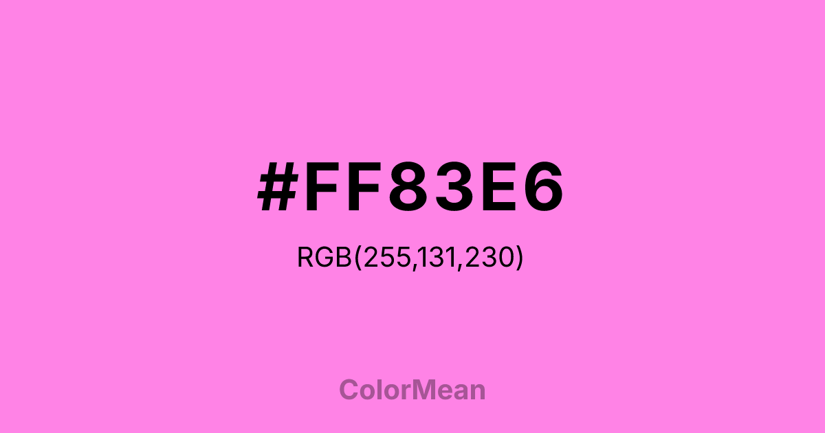 #FF83E6 RGB value is (255, 131, 230). The hex color red value is 255, green is 131, and blue is 230. Its HSL format shows a hue of 312°, saturation of 100 percent, and lightness of 76 percent. The CMYK process values are 0 percent, 49 percent, 10 percent, 0 percent.